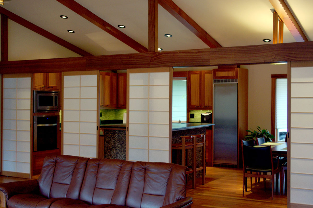 A fixed shoji panel provides light and privacy between the dining room and entry.